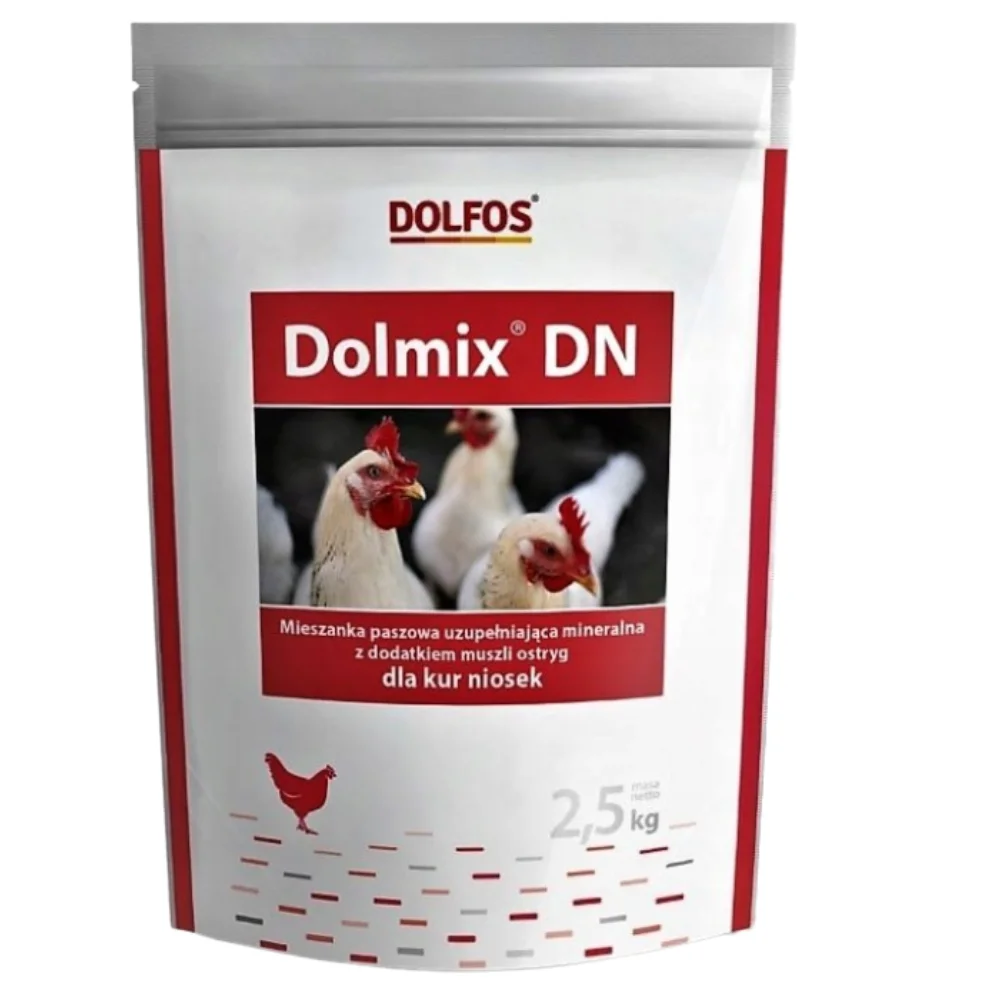 Mieszanka paszowa Dolmix DN Dolfos to uzupełniająca mieszanka mineralna z dodatkiem muszli ostryg dla kur niosek, szczególnie dla kur z wolnego wybiegu. Dolmix DN to przede wszystkim witaminy oraz makro- oraz mikroelementy niezbędne dla prawidłowego wzrostu i rozmnażania kur. Wspomaga Cię w hodowli mięsa drobiowego bez antybiotyków i stresu oraz produkcji zdrowych i smacznych jaj. Mieszanka jest wolna od organizmów modyfikowanych genetycznie GMO, co stanowi znaczącą przewagę nad konkurencyjnymi suplementami witaminowymi dla niosek.