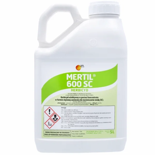 Mertil 600 SC to selektywny herbicyd stosowany doglebowo lub nalistnie, dostępny w formie koncentratu do rozcieńczania wodą. Zawiera diflufenikan o działaniu kontaktowym, który hamuje biosyntezę karotenoidów, oraz flufenacet, wpływający na syntezę kwasów tłuszczowych, co skutecznie eliminuje chwasty we wczesnych fazach rozwojowych. Środek działa przez wiele tygodni po zastosowaniu, a jego skuteczność zwiększa optymalna wilgotność gleby.